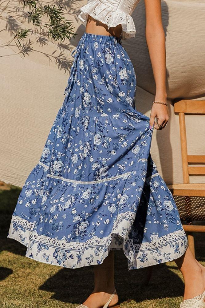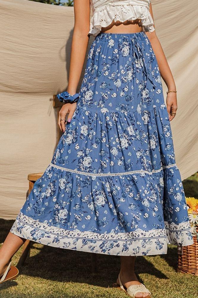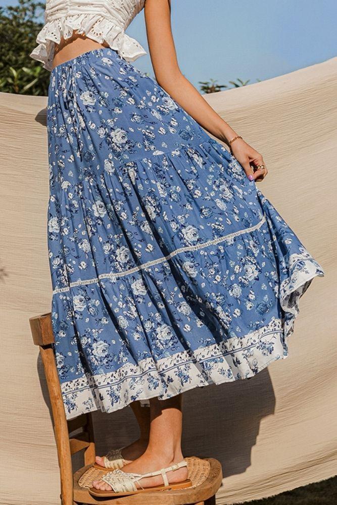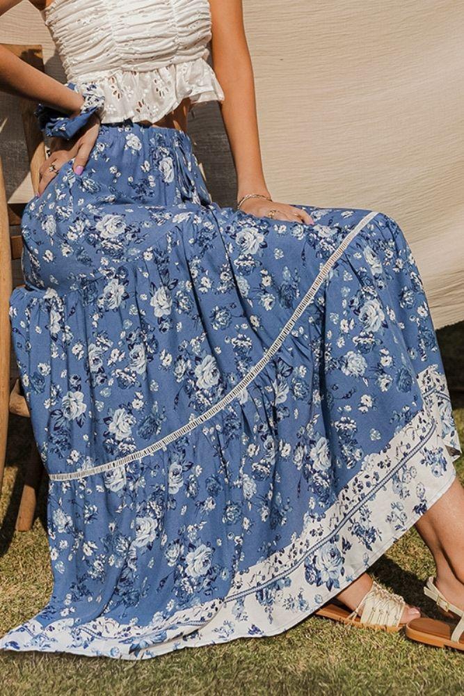 Jupe longue fluide et fleurie dans les tons bleus bohème