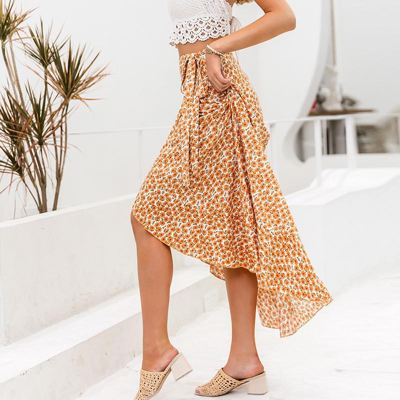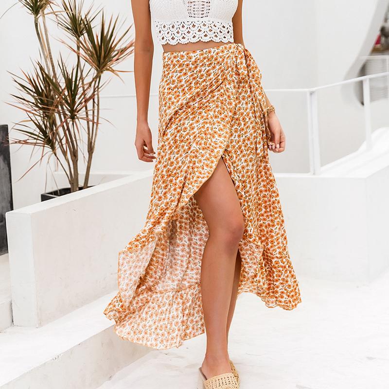 Cette jupe longue blanche bohème est ornée de superbes motifs jaunes vifs. Elle est dotée d’une coupe longue et a une jambe divisée. Elle peut être nouée à la taille pour mettre en valeur votre silhouette.