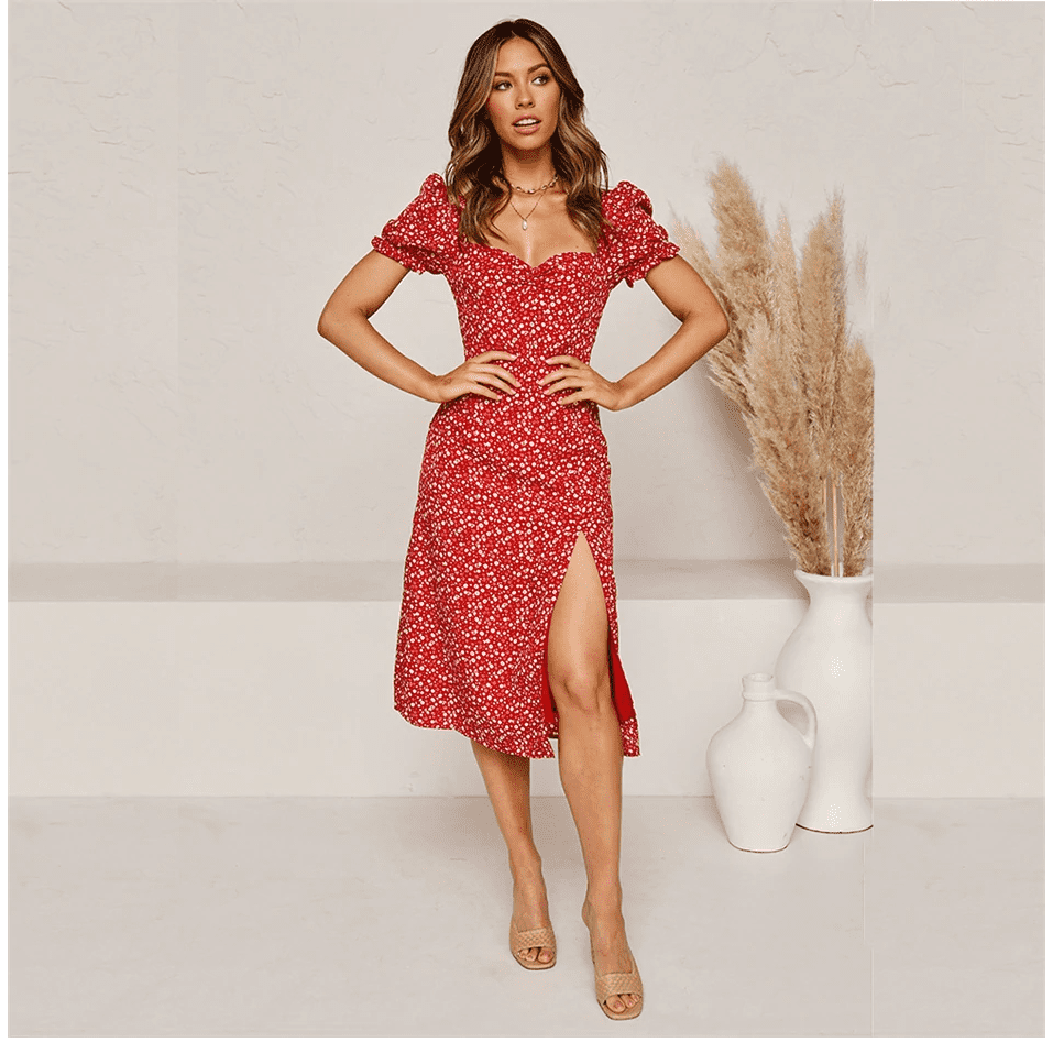 • Détails : robe courte au genou, fendue