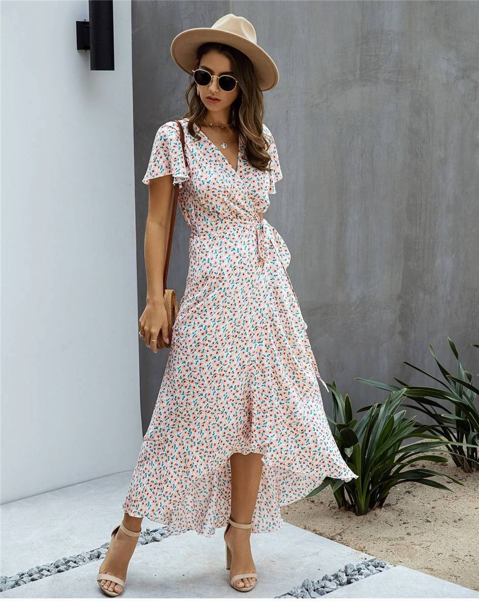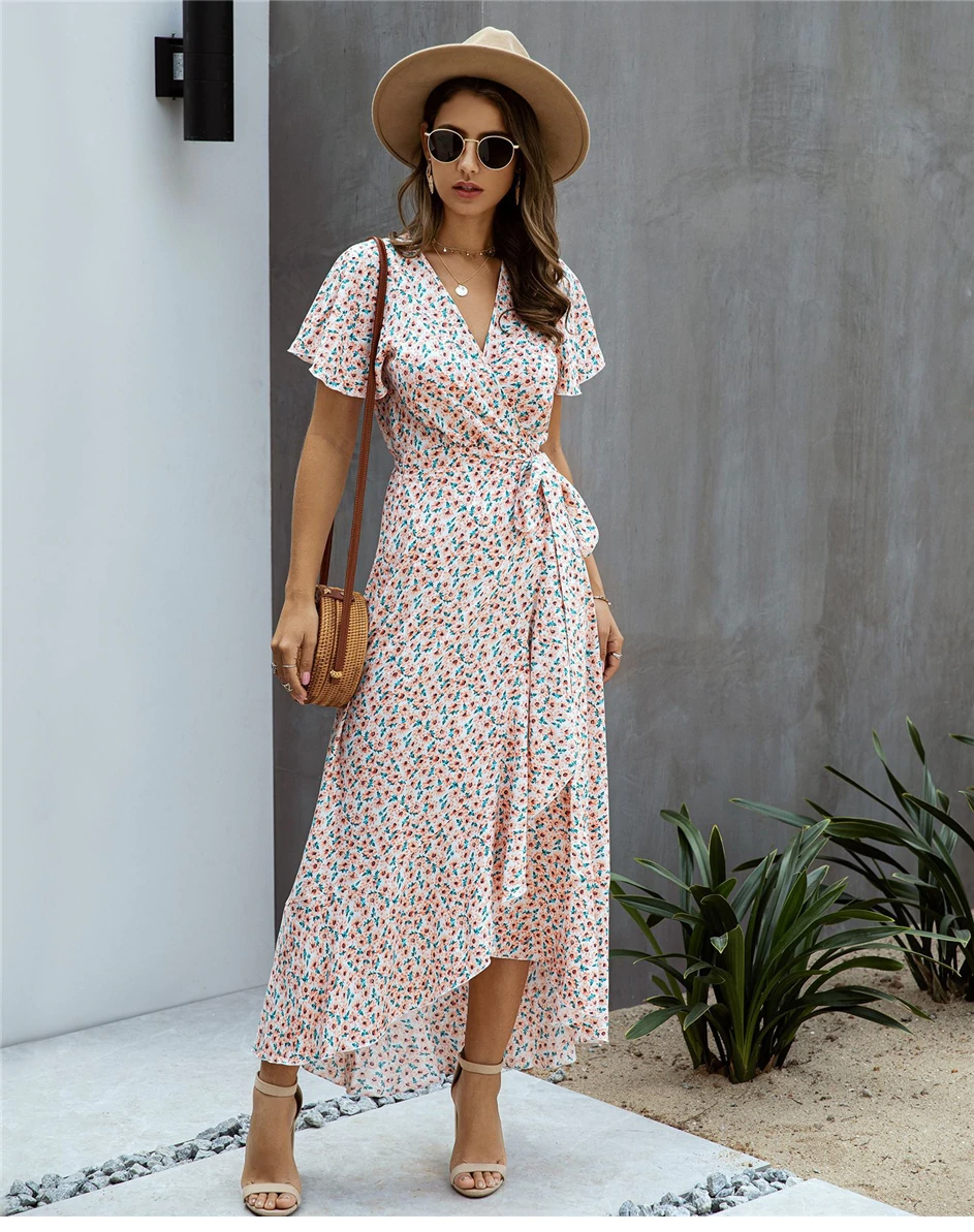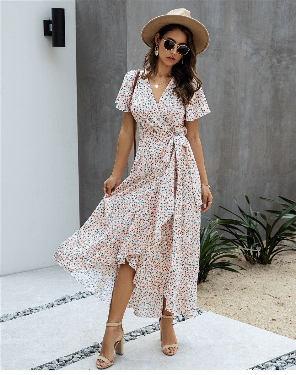 Sa coupe évasée fendue sur le côté de la jambe apporte une touche de sensualité à la robe longue. Son col en V, ses manches courtes et sa ceinture nouée soulignent cette allure.