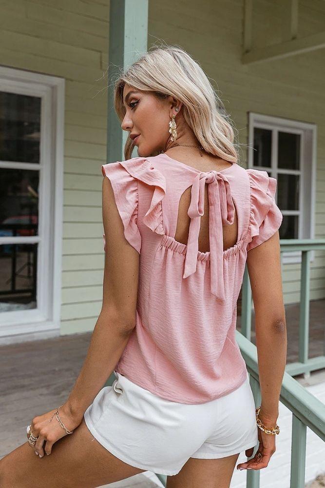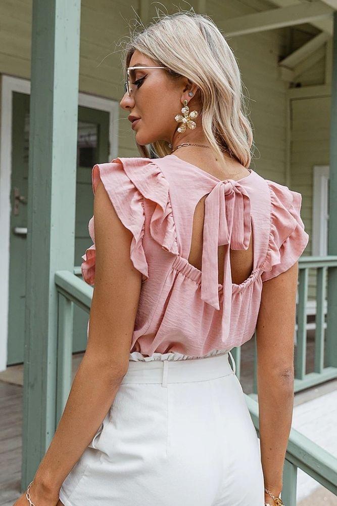 Chemise bohème rose à volants, sans manches, dos ajouré